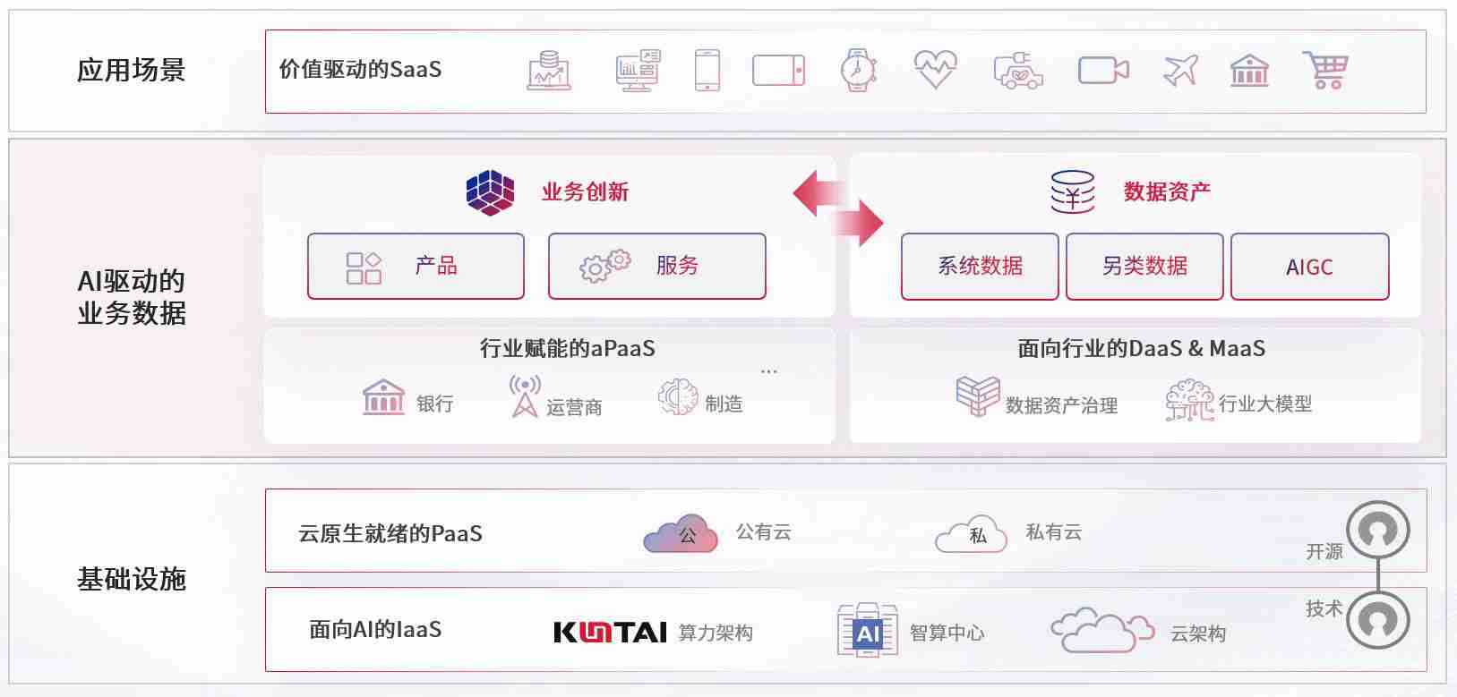 数字时代,,围绕企业数字化转型的关键要素,,伟德bv1946数码开创性的提出数云融合战略和技术体系框架,,,着力在云原生、、、数字原生、、AI原生和信创产业上架构产品和服务能力,,,为处在不同数字化转型阶段的快消零售、、、汽车、、金融、、、医疗、、政企、、、教育、、运营商等行业客户提供泛在的敏捷IT能力和融合的数据驱动能力,,,构建跨界融合创新的数字业务场景和新业务模式,,助力企业级客户建立面向未来的核心能力和竞争优势,,,全面推动社会的数字化、、智能化转型升级。。