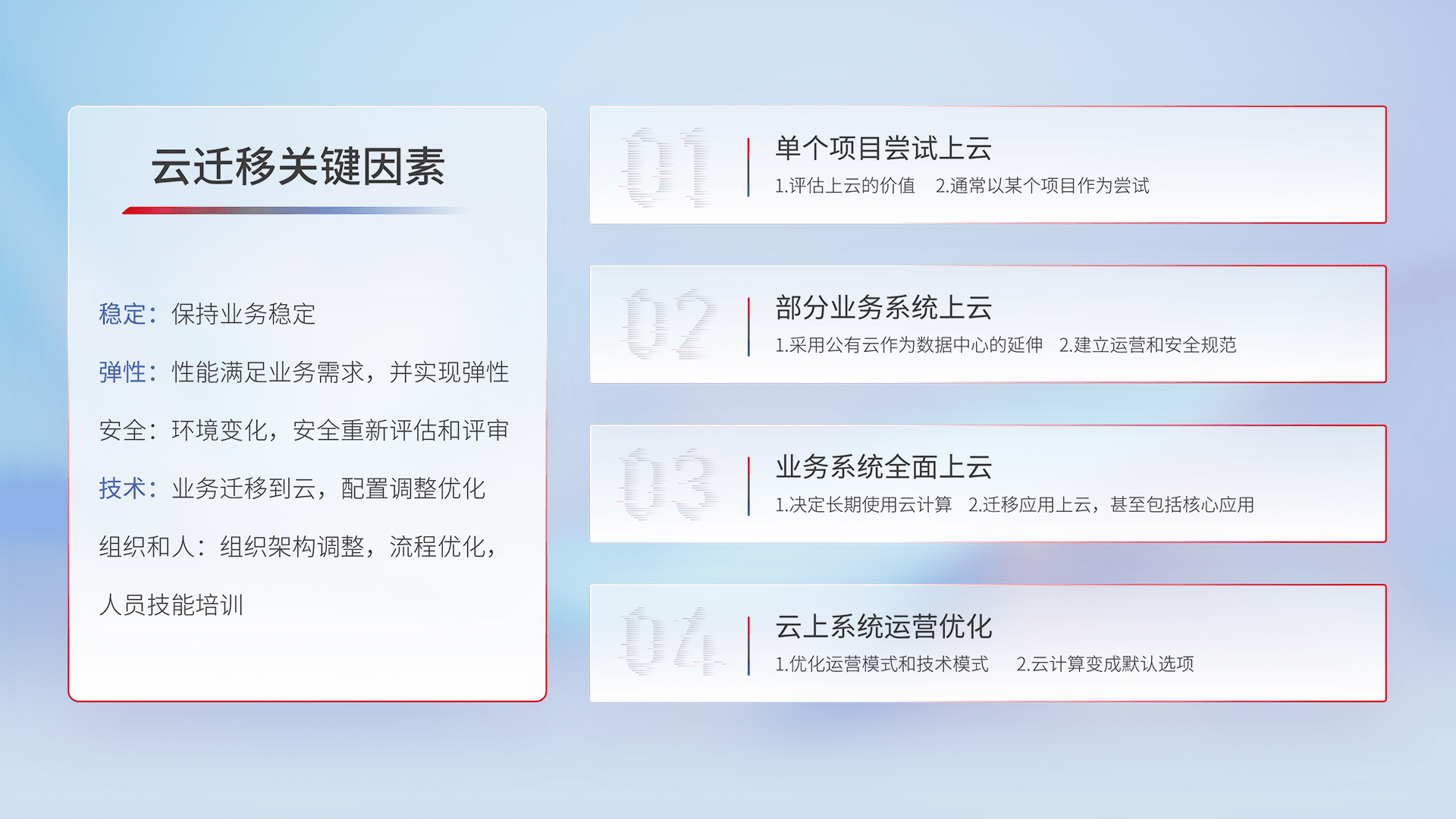 结合实际业务,,,,从规划设计、、、、云平台选型、、、、云原生改造、、数据迁移、、、集成交付,,,,迁移全过程为客户识别最佳上云路径,,,,做好风险识别管理,,,设计网络架构、、身份权限、、、、安全审计合规、、、操作审计、、、日志审计、、、监控告警策略、、多站点容灾设计等,,,,对云上基础设施进行整体规划,,,,提升IT治理水平,,,以满足弹性、、、、高可用、、、、高性能的需求。。。。